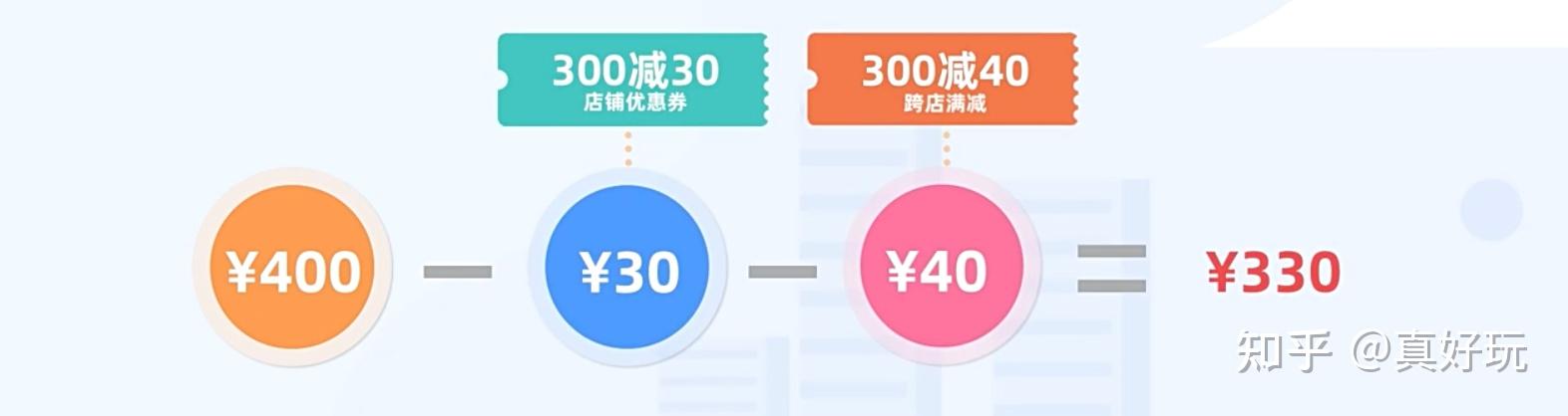 举个例子:商品活动价300元,店铺优惠券20 元,品类购物券满200减20元,消费券10元 无门槛红包10元,但参与跨店满减的金额仍为 300元。