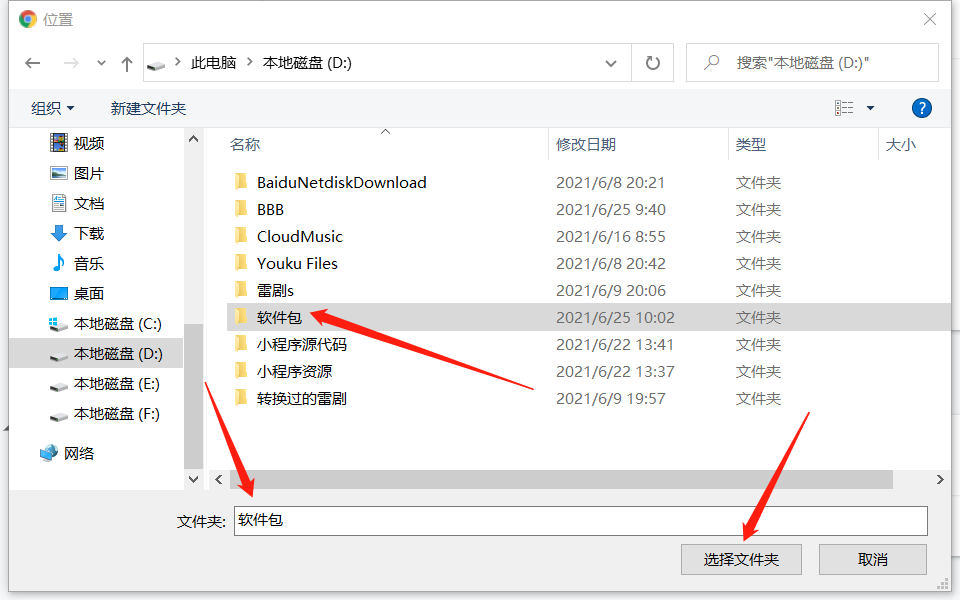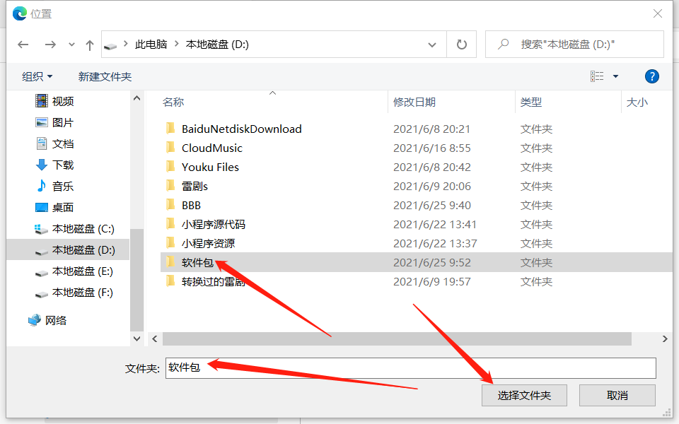 随便选一个盘来存放下载软件包,这里我选择D盘