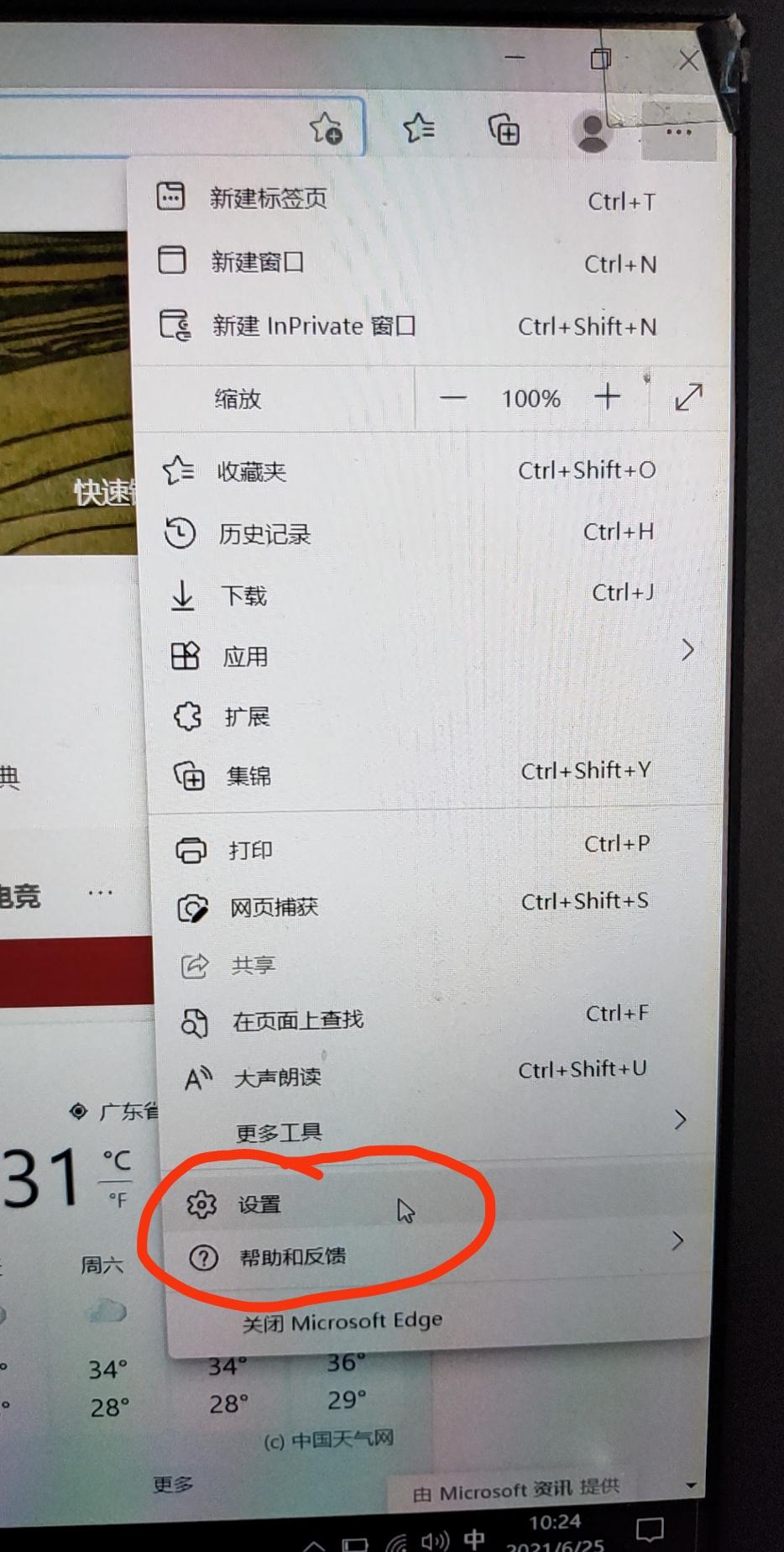 点击:三点号(...)打开浏览器菜单栏,然后点击:设置