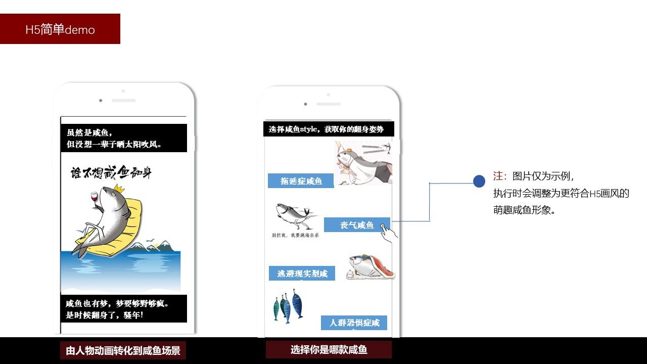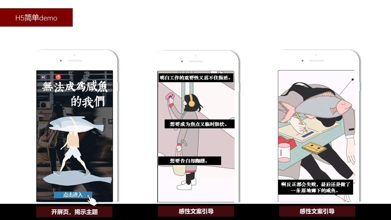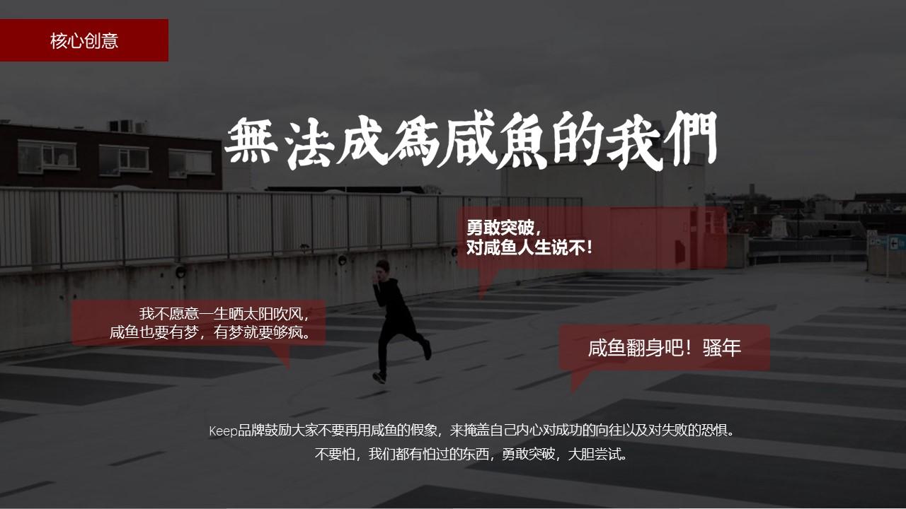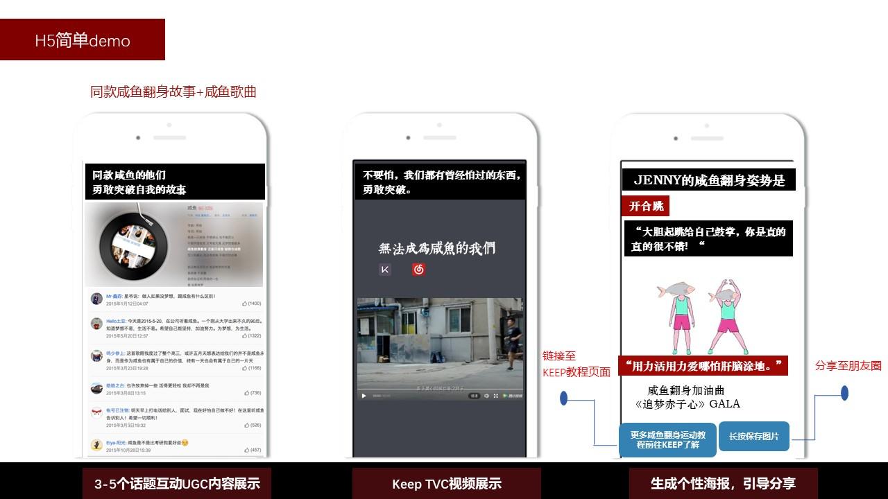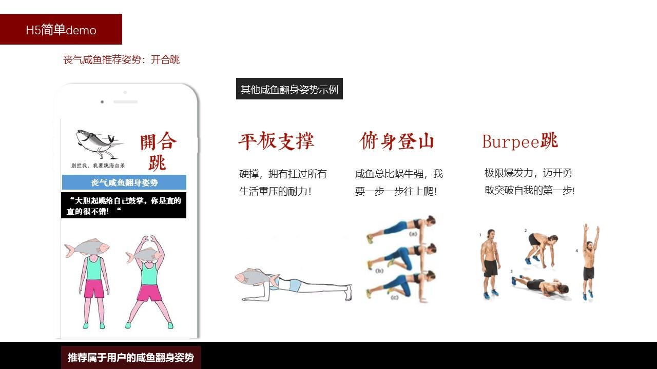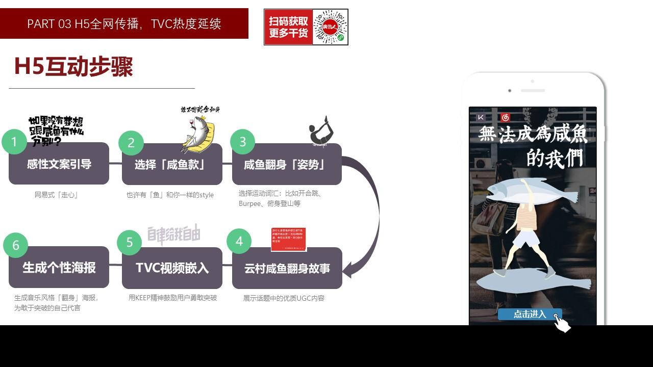 对年轻人的洞察清晰彻底;H5规划中将Keep教程中的“开合跳”/“俯身登山”/“平板支撑”等运动姿势类比衍生为急需突破心理恐惧障碍的年轻人“咸鱼翻身”姿势,有趣生动地推广了keep品牌精神及产品。