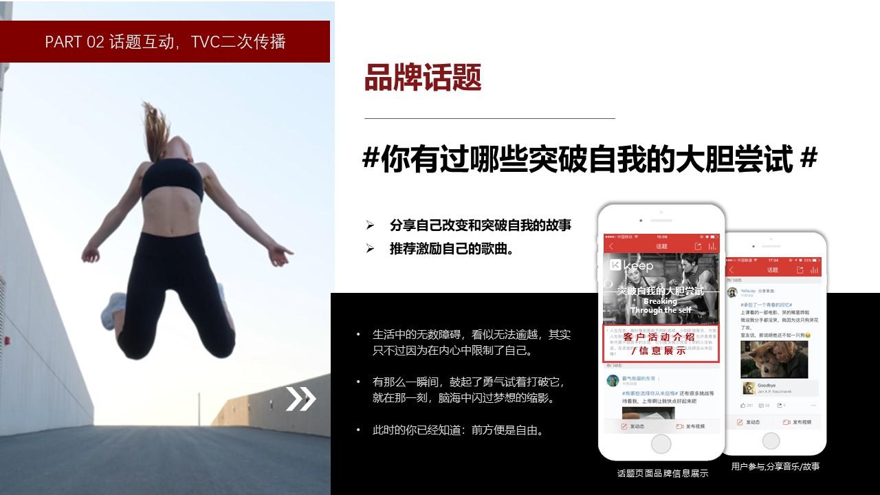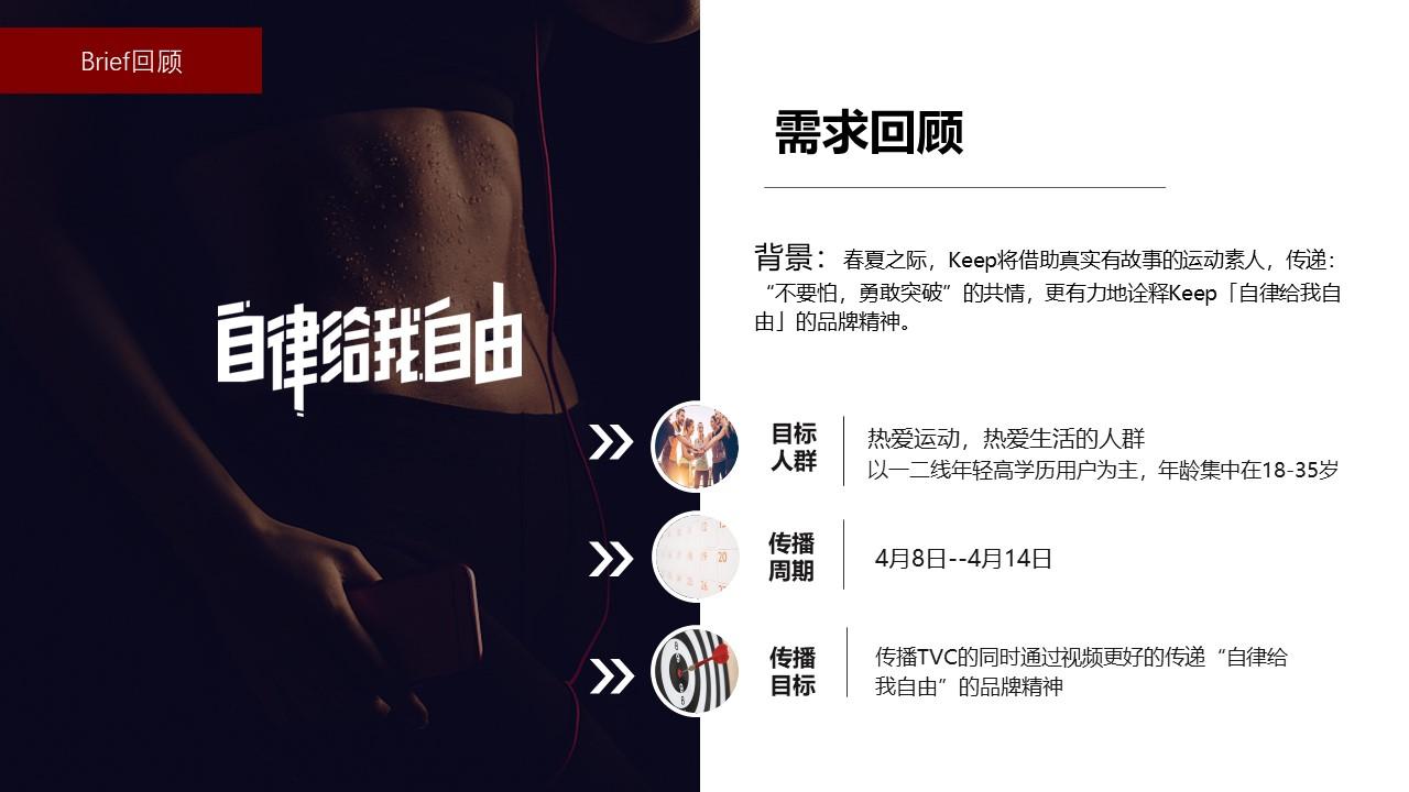 春夏之际,以以一二线年轻高学历用户为主,年龄集中在18-35岁的热爱运动,热爱生活的人群为目标人群,Keep将借助真实有故事的运动素人拍摄全新TVC,传递:“不要怕,勇敢突破”的共情,更有力地诠释Keep「自律给我自由」的品牌精神。