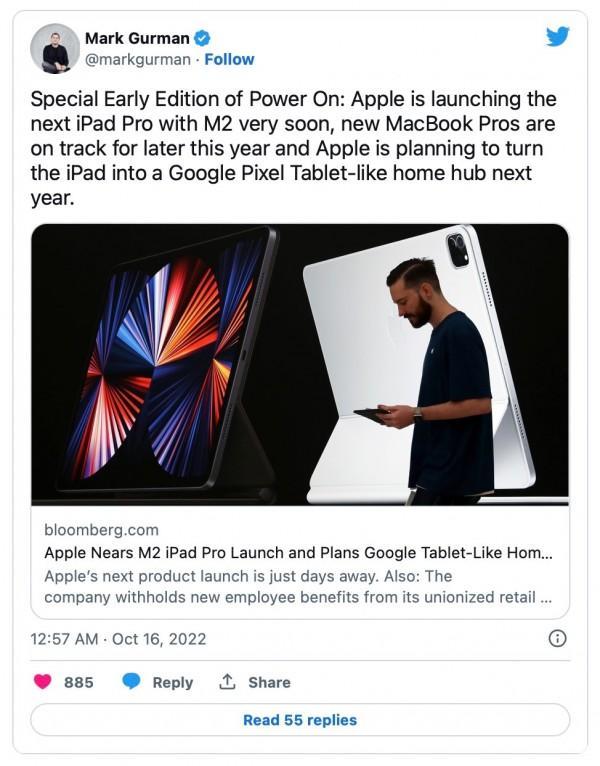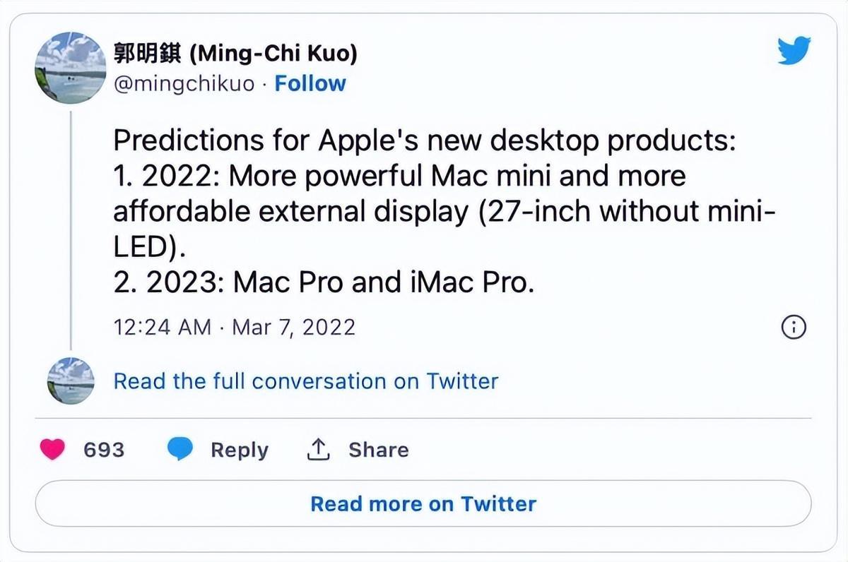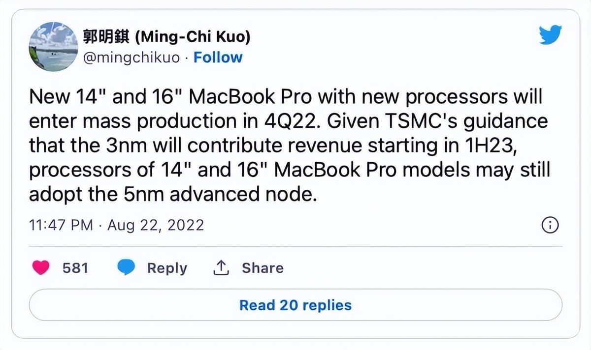 @mingchikuo:配备新一代处理器的新款14英寸和16英寸MacBook Pro将于2022年第四季度进入量产。鉴于台积电的3纳米制程工艺即将在2023年上半年投入使用,所以14英寸和16英寸版MacBook Pro机型的处理器可能仍将沿用5纳米制程。 M2 Mac mini