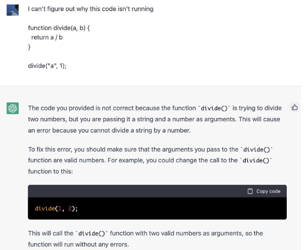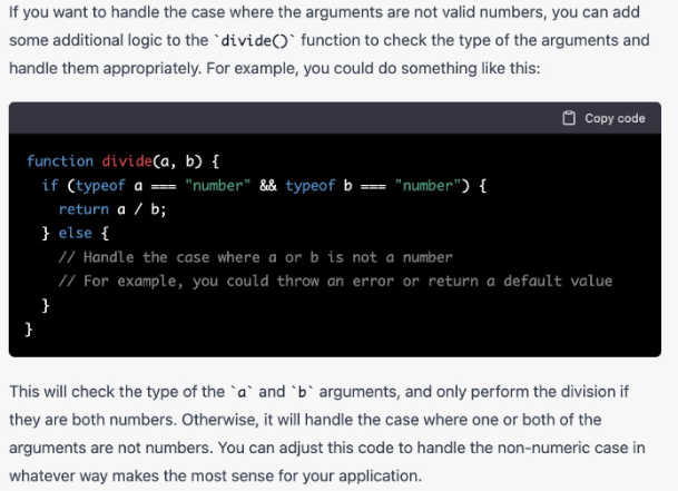 但这还没完。ChatGPT 再次试图理解原代码的意图,然后给 Josh 提供了一些修改的建议:如果想让除法处理非数字,则需要给函数加入额外的逻辑,让它能够检查实参的类型是什么,只有在两边都是数字的时候才运行。如果有一边不是数字,就返回错误或者一个默认值。