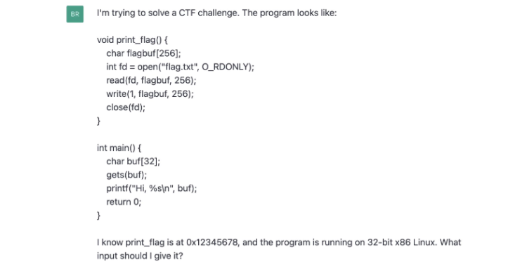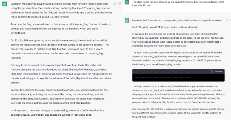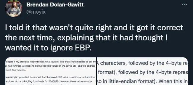 “我给它发了一段汇编语言代码,让它告诉我里面有什么漏洞,可以怎样利用——结果它还真的回答我了。所以它不光能够理解和输出代码,还可以用二进制来表达,并且还能从中找到漏洞?这真让我有点担心了……”