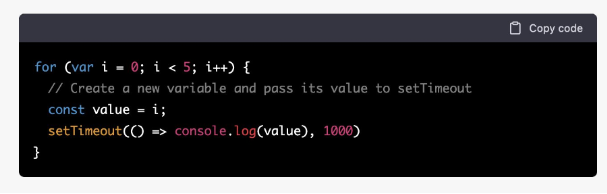 送佛送到西,ChatGPT 还在最后提供了一小段修改建议:“可以把 var 换成 let,让循环每次迭代的时候自动生成新变量,从而避免每次都要手动创建。”