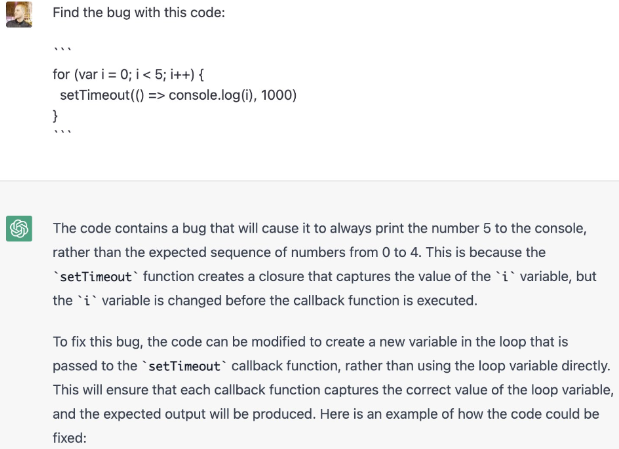 技术公司 Replit 的创始人给 ChatGPT 发了一段 JavaScript 代码,让它找到里面的 bug。