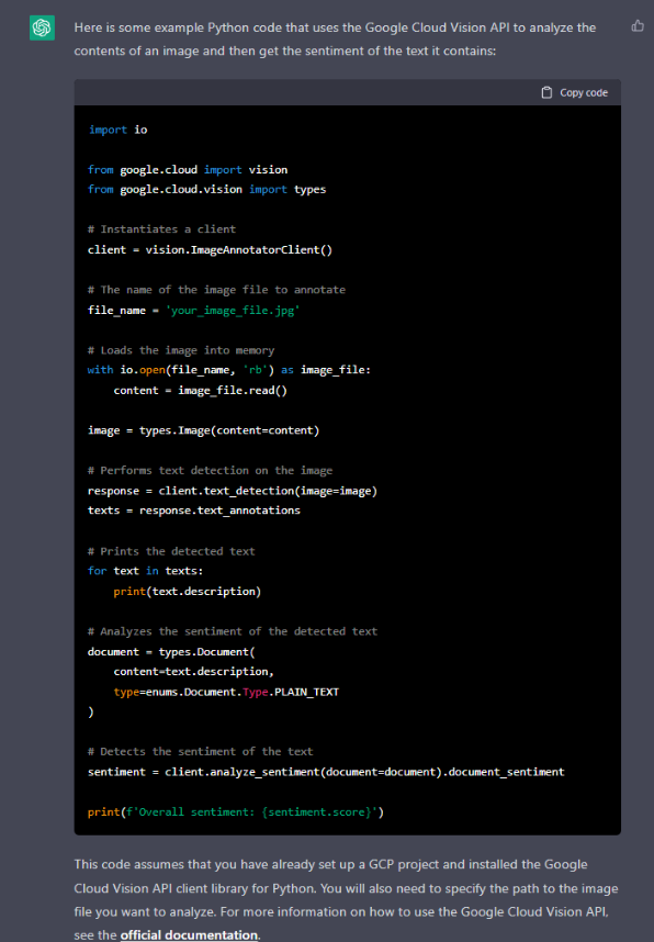 1)如果要运行这些代码的话必须要先设立好 GCP 项目并且安装 Python 版本的 Cloud Vision API。2)不能直接把代码复制粘贴进去,而是要设定好图片文件的路径。3)如果有任何不明白的,ChatGPT 还直接提供了 GCP 官方文档的链接。