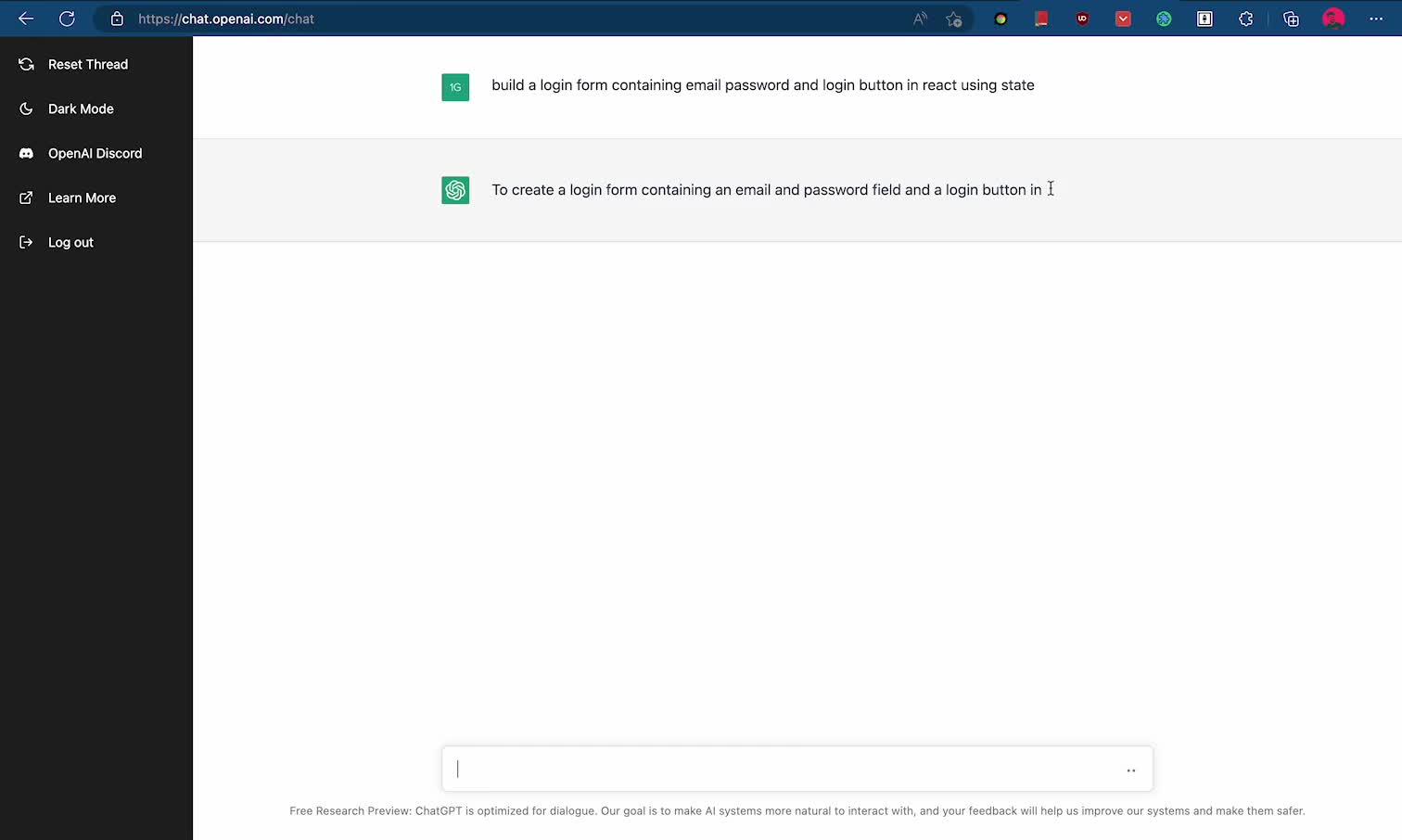 下面这个视频展示了让 ChatGPT 生成一个带有电子邮箱、密码输入框,以及登陆按钮的登陆界面。ChatGPT 先是进行了分解演示,然后用户又让它直接提供全部代码: