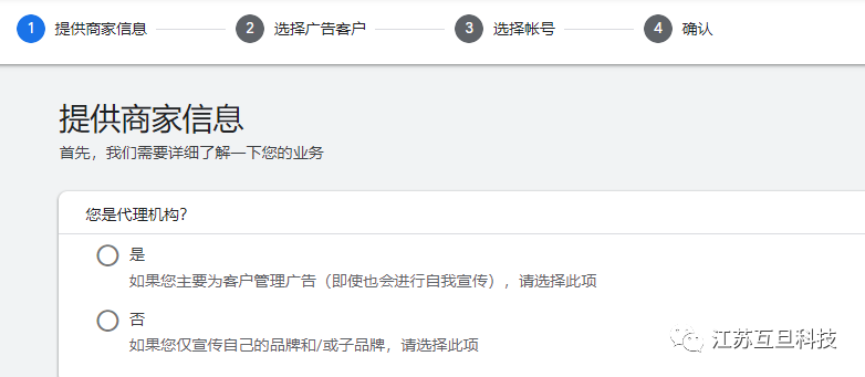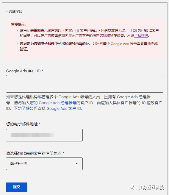 选择好上述问题后,就会看到需要填写的表单,需要注意的是“google ads ID”是需要进行验证的账户id,不是代理商的id,注册地点需要与我们营业执照上的地址相符。
