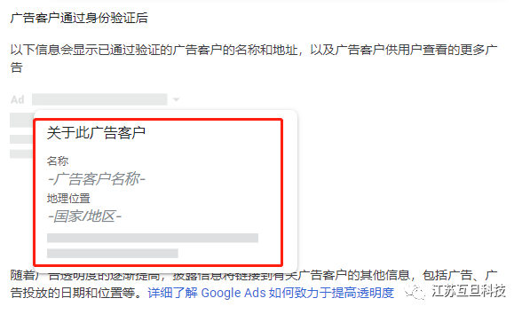 为确保所有人都能获得安全可靠的广告体验,谷歌在2020 年 4 月宣布,将验证每位使用 Google Ads 的广告客户的身份。谷歌广告客户验证,主要就是提高广告透明性,让谷歌的用户了解他所看到的广告背后的广告主(公司信息和地理位置),帮助用户识别欺诈性和误导性内容的广告,同时也提高了用户对广告的信任度。