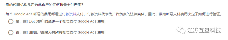 在填写此表单之前,请确保拥有此 Google Ads 帐号的付款资料,并在结算设置中将“帐号类型”设置为“组织”。