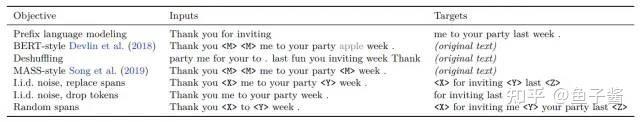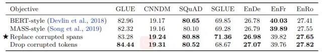 实验表明BERT-style预训练目标的效果最好,因此作者又进一步分析了该目标的几种变种形式,如下图: