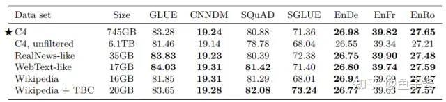 作者对公开爬取的网页数据集Common Crawl进行了过滤,去掉一些重复的、低质量的,看着像代码的文本等,并且最后只保留英文文本,得到数据集C4: the Colossal Clean Crawled Corpus
