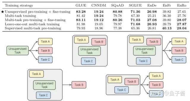 从实验结果可以看出,(1) Multi-task pre-training + fine-tuning的效果可以和baseline Unsupervised pre-training + fine-tuning差不多;(2) 去掉无监督任务的Supervised multi-task pre-training的效果很差,说明无监督预训练确实很有用,此外,可以发现在翻译任务EnDe、EnFr、EnRo上的效果没有下降很多,可能是因为只预训练英文语料对翻译任务影响不大。