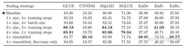 从表中可以看出,(1) 扩大模型规模和增长训练时间都能提高模型性能;(2) 将模型扩大到2倍规模,同时训练时间也扩大2倍的效果和将模型扩大到4倍规模的效果差不多,说明增加训练时间和扩大模型规模很可能是两种互补的可以提高模型性能的方法;(3) emsemble对提高模型性能确实有效。