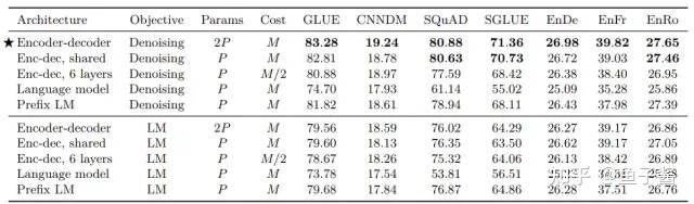从表中可以发现,(1) 采用encoder-decoder结构且使用Denoising目标函数的效果最好; (2) encoder和decoder共享参数(Enc-dec, shared)的结构表现也差不多好; (3) 相同参数量的encoder-decoder结构(Enc-dec, shared)要比Prefix LM结构的效果好,说明添加显式的encoder和decoder之间的attention是有用的; (4) 采用Denoising目标函数的效果要好于采用一般的语言模型目标函数。
