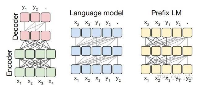 最右侧的Prefix LM结构中,采用causal with prefix attention mask。比如在翻译任务中,给定训练样本translate English to German: That is good. target: Das ist gut.,我们对translate English to German: That is good. target:采用fully-visible attention mask,对Das ist gut.采用causal attention mask。