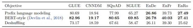 其中Replace corrupted spans就是上上图中的noise replace spans目标,Drop corrupted tokens就是上上图中的noise, drop tokens目标。结果表明,这几种BERT-style预训练目标的变种效果差不多,但是后两种方法不需要预测整个输入序列,而仅需要预测被污染的部分,因此预测的序列长度更短,训练速度也更快。