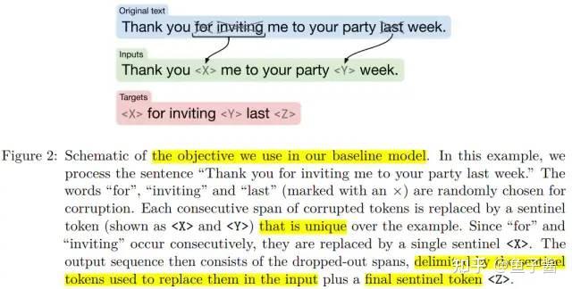 如图所示,在输入样本中,用一些唯一的特殊符号<X>, <Y>来表示原始样本中被随机masked的span或token,而目标样本则为被masked的span或token序列,用输入样本中对应位置的特殊符号<X>, <Y>分隔,最后加上一个特殊符号<Z>表示序列结束。