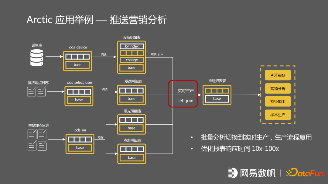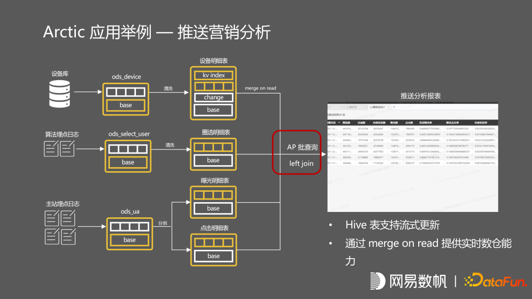 这是在网易云音乐的应用案例,它是一个推送系统分析,有两张主站埋点的 log 日志,及算法埋点的 log 日志。设备库是一个 mysql 维表同步。分析师想要知道推送的效果,需要通过报表进行查询。它是通过一个 IP 的查询来回的 join 这些表,走的批的流程,跟原来的批计算流程完全一致。如果分析师在报表分析之后,去做算法上的优化。可以在架构不发生变化的情况下,立刻推送到面向流的应用,同样是个 left join,但是它走的流程全部是这种流的生产路径,数据全部经过 kafka 做来回的校验,最终推送到归因表中,最后由数据应用去使用流计算出来的结果数据,整个生产链路包括数据存储,指标也不存在二义性,只有一份的数据存储,任务等实现百分百复用。