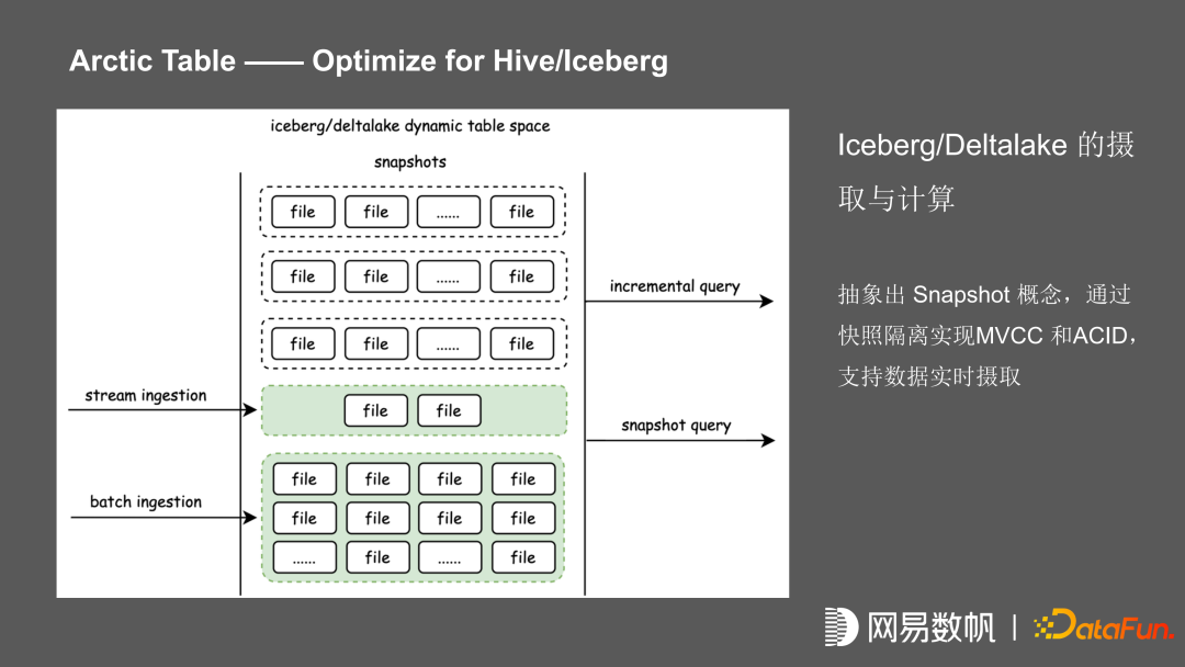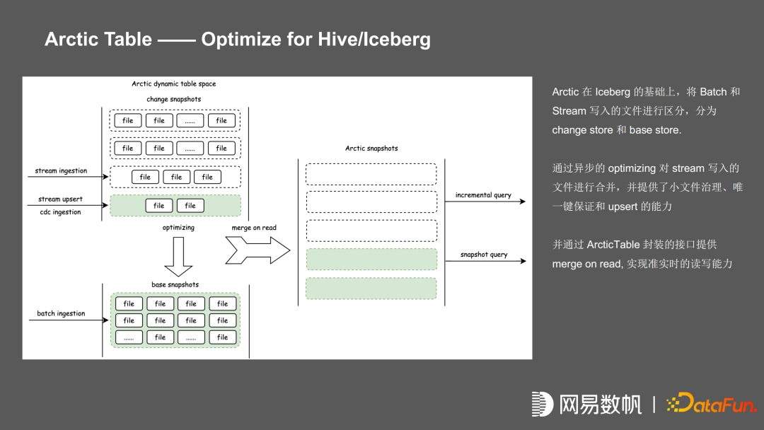 Iceberg 通过快照的隔离实现了 MVCC 和 ACID, 在基于 MVCC 和 ACID 的情况下,可以支持数据实时摄取,也支持准实时的 incremental query。在 Iceberg 的基础上,Arctic 进一步进行了区分,把 batch 数据和 stream 的数据写入的文件进行分区,分为 change store 和 base store。通过异步的 optimizing 对 stream 写入的文件进行合并,并提供了小文件治理、唯一键保证和 upsert 的能力,通过 ArcticTable 封装的接口提供 merge on read,实现准实时的读写能力。