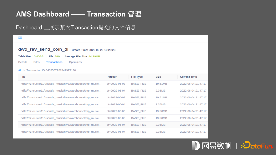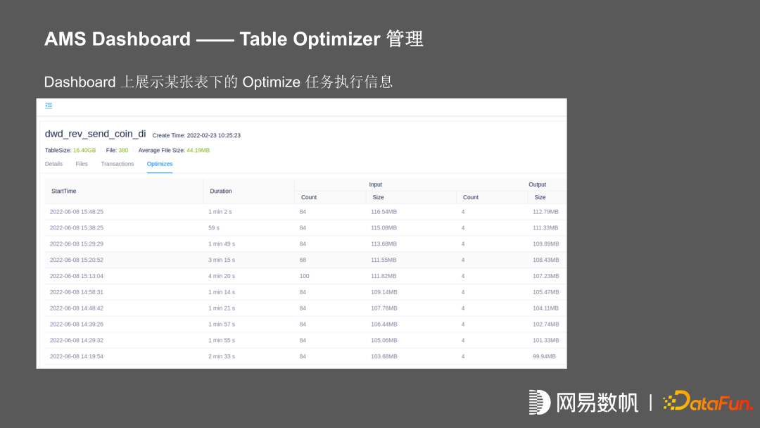 上图为 dashboard 展示的某张表在某一个 transaction 中,所提交的所有文件信息,还有在 optimize 的执行信息,我们可以看到它在某一次 optimize 执行之后,将 84 个文件合并成 4 个。