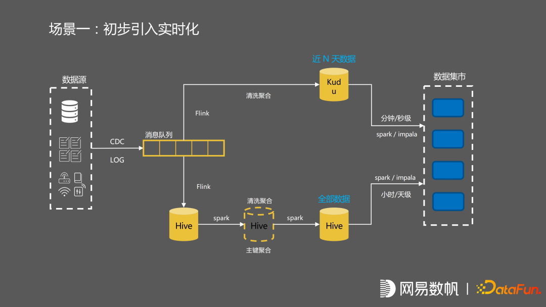 离线流程保持不变的情况下,用 Flink 去做一些清洗聚合,最后数据进入到 kudu当中。在数据集市中,对两边 hive 的数据和 kudu 中的数据进行合并。kudu 这边流的数据,有分钟级别的延迟。hive 这边是一个小时级别或者天级别的数据流,最终在数据集市中做聚合。