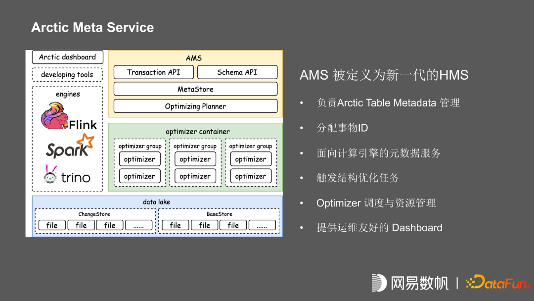 Arctic meta service,简称AMS,它的定位是未来的 HMS。负责 Arctic Table Metadata 的管理,分配事物 ID,提供面向数据引擎的元数据服务。在 AMS 内部可以进行多个 HMS 管理,AMS 还负责触发表结构优化任务,优化任务包含基于时间的触发,基于文件大小,小文件碎片的评估的自动触发;以及优化任务的调度与资源管理,同时提供运维友好的 Dashboard。