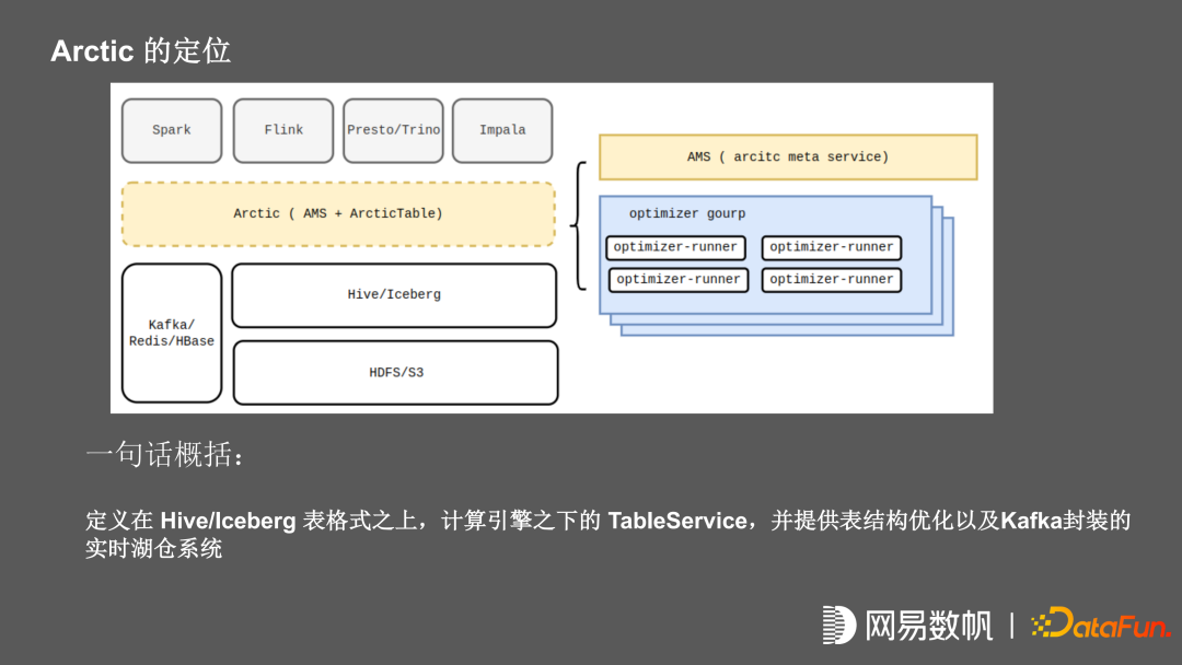 基于以上现状,我们研发了 Arctic 产品,它是基于 Iceberg 去构建湖仓一体的系统。其定位是在 hive 和 Iceberg 之上,在计算引擎之下的一个 TableService, 并提供表结构优化以及 Kafka 以及 redis, Hbase 等 KV 存储封装的实时湖仓系统。
