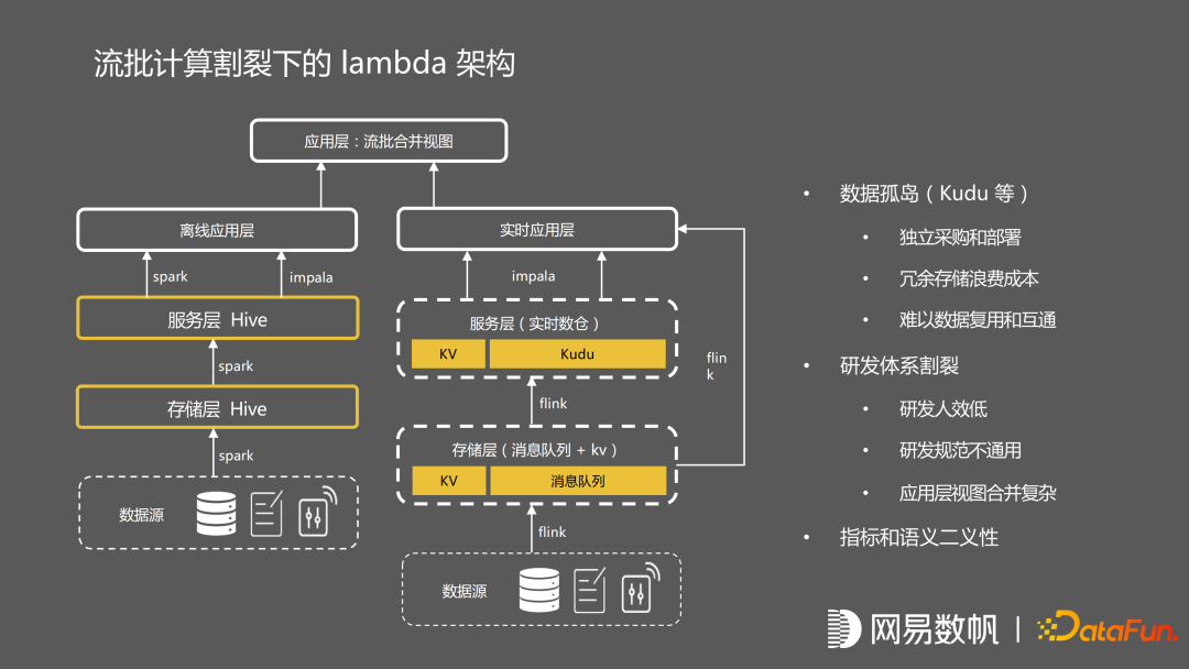 这是一个很典型的 Lambda 架构,流与批的流程是割裂的。这种割裂的 Lambda 架构,最大的问题就是数据孤岛的问题,因为有大量的流的数据存在 kudu 当中,kudu 是一个独立部署的架构,无法利用 hadoop 的整套生态体系,离线的数据也没办法复用,其次是研发体系上流和批处理完全是割裂的,人效很低,并且无法统一指标和语义。