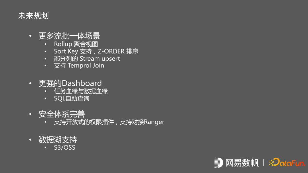 会更加专注于流批一体的场景,提供 doris 一样的 RollUp 聚合视图, 提供 sort key 的支持,支持简单的 sort key 排序或者 z-order 的排序,以及部分列的 stream upsert,支持 temperol join。
