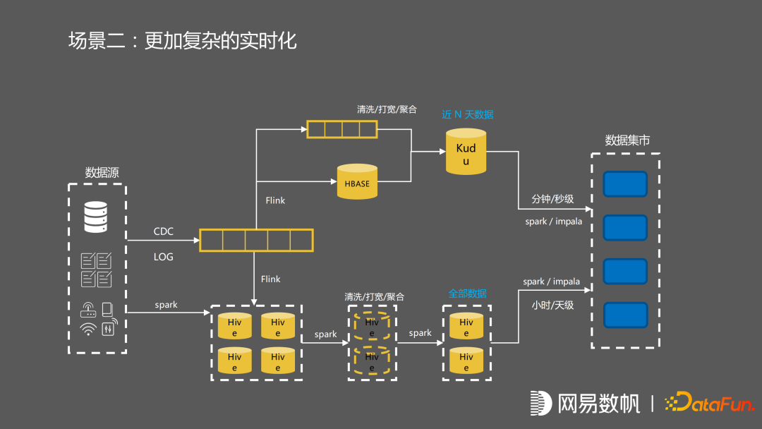后来我们引入了更复杂的逻辑。首先包括一些清洗打宽聚合的逻辑,一些 Flink 任务开始去往 Hbase 里面生成维表数据,然后在流这边先做一个聚合之后才落入 kudu 当中,最后在数据集市再把流和批去做整合。