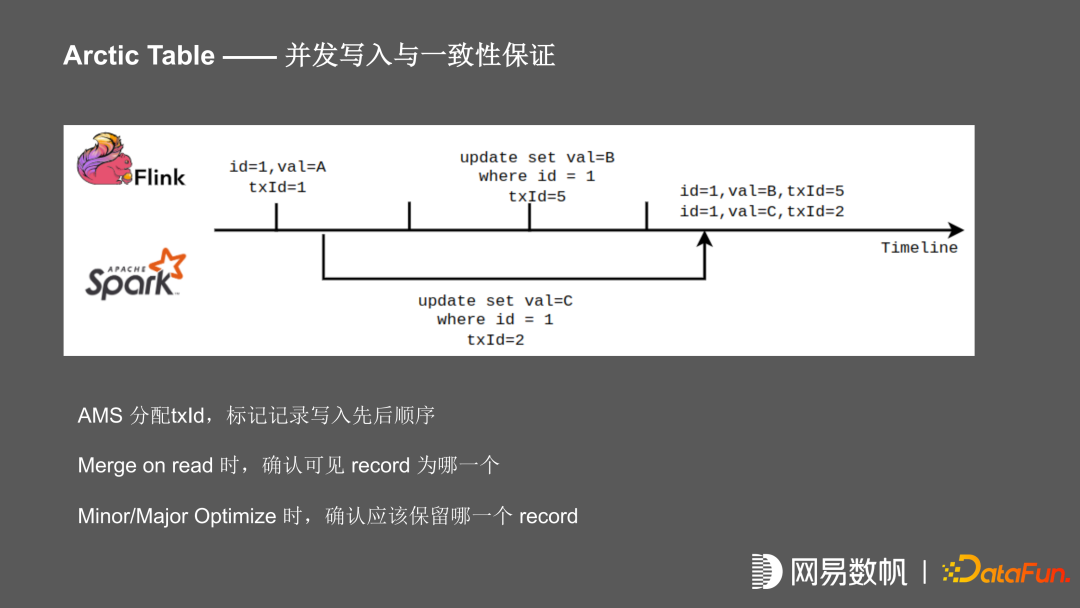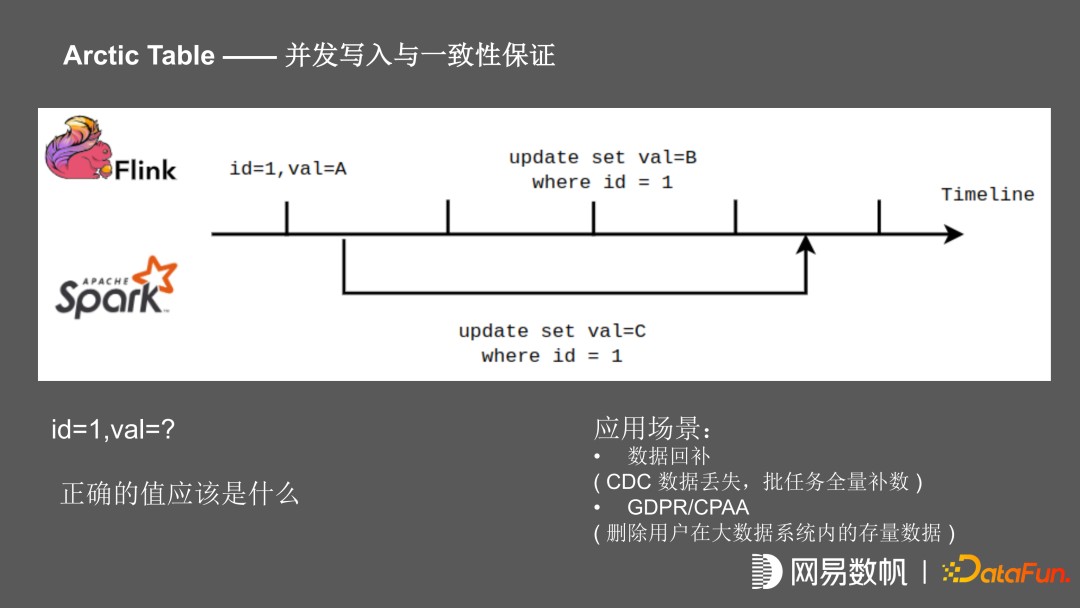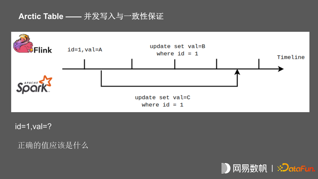 为了支持流、批的同时,写一张 Arctic 表,在并发写入时涉及一致性问题。比如在这个场景中,在某个时间点的记录 ID =1,value=A,这个时候开始 spark 任务,将 value 更新为 C, flink 任务启动之后一直在写,在后面 commit 的时候把值 value 更新为 B,在任务结束之后该记录值应该是多少?由于 Iceberg 在 commit 的时候做 ACID 的保证,且 Flink 任务是先 commit 的,Spark 任务是后 commit 的,在这个时间点,它的 value 应该是 C。但是我们按照传统数据库的视角来看,spark 任务在开启时 value 已经确定,这时 Flink 任务进行更新,记录已经被锁住,当 spark 任务进行 commit 之后,记录才能够被更新,在数据库的视角来看,在这个时间点该记录 value 应该为 B。