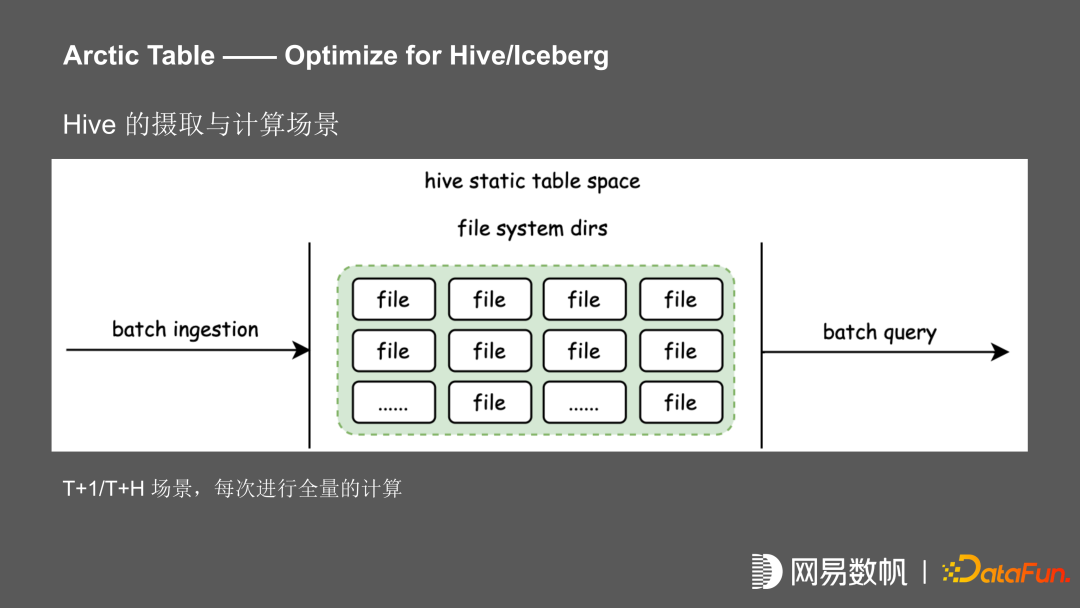 上图是一个 T+1 的 hive 计算场景。一个批的数据,进行了 T+1 或者 T+H 的摄取,再进行批的计算,每次都进行了全量的摄取或计算,在此基础上我们引入了 Iceberg 和 Deltalake。