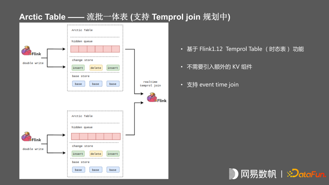 同时为了支持将 Arctic 当维表使用,实现了一个 hidden 的 index,内部封装了 Hbase或 Redis,支持在上游写入实现双写,数据写入 redis 或 HBase,下游不需要关心实现细节,将 Arctic 当成维表使用,但这种情况下,目前没有比较好的办法解决一致性,未来会实现 flink1.12 中提出来的时态表 temporal join,无需依赖外部 KV。