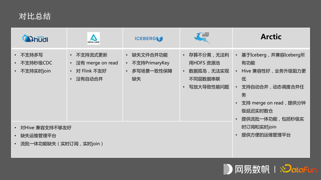 我们在立项的时候,对目前的数据湖产品,以及数据仓产品进行对比;其中与 Arctic 定位最相似的是 Hudi。Arctic 与 Hudi 的区别在于,Hudi目前对于多写的场景支持的不是很好。它的 CDC 目前还是分钟级的,并不是秒级;而且以它当维表的情况下,用起来不是太友好。另外,Arctic 和 Hudi 的底层不一样,arctic选用更面向未来的,在未来可能会替代 hive 的 iceberg 作为底层。Kudu 的主要痛点是存算不分离,无法利用 HDFS 的资源,存在数据孤岛,无法实现不同层数据串联,以及存在性能问题。