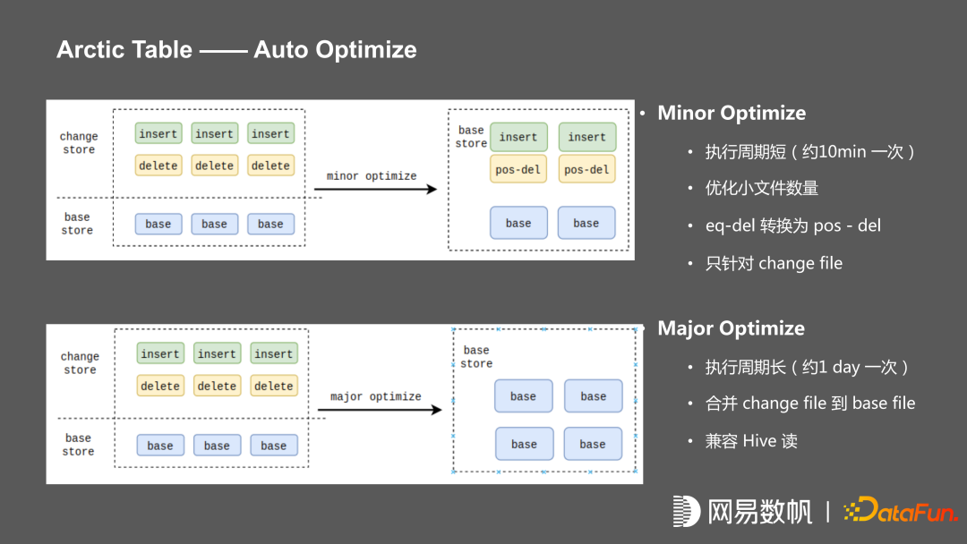 我们对 Arctic Table 做了两种 Optimize,一种是短周期的 Minor Optimize,大约 5 到 10分钟执行一次,主要提供小文件的治理,把写入 change store 中间的 equal delete 转换 pos-delete。另外一种是长周期的 Major Optimize,大约 1 天执行一次,将 insert file 和 change file 合并到 base file,当合并的 major optimize 执行完成之后,就只有 base 表,base 文件与 hive 格式完全兼容。