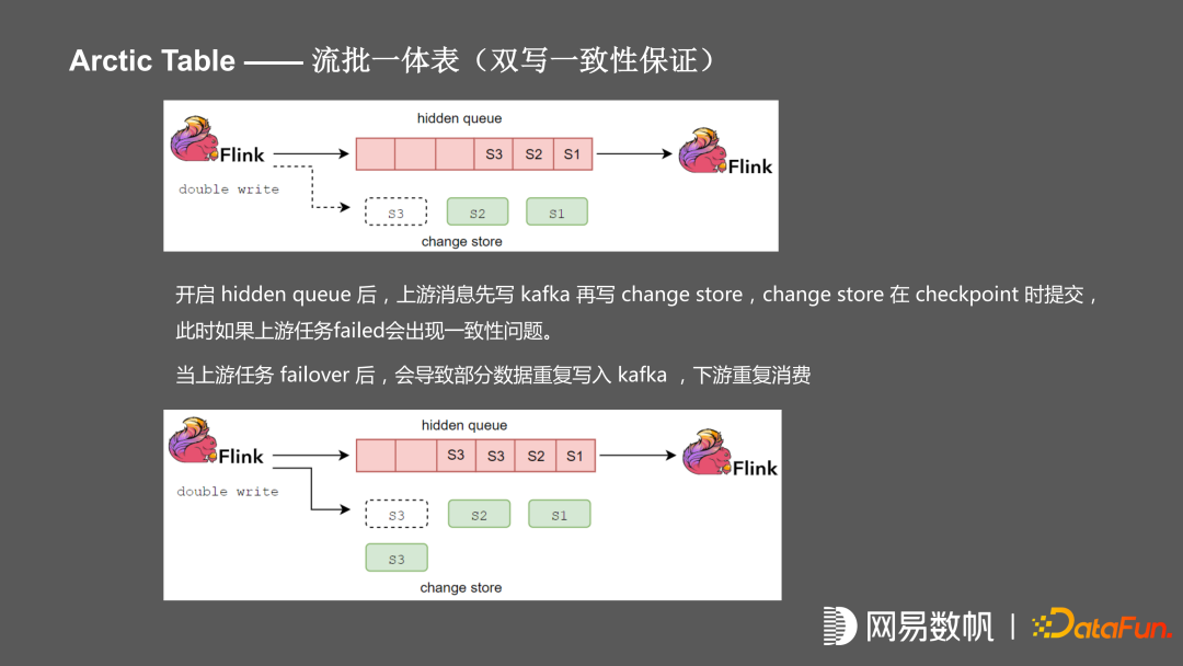在双写情况下会遇到一致性问题,比如上游 Flink 任务在双写的时候,要保证毫秒级和秒级延迟,需要先写入 kafka,再写入 iceberg 文件,可能会在写入的时候,任务发生故障,导致 iceberg 文件并没有提交,而下游已经消费了未提交的数据,如果上游任务做了 failover 会导致部分数据重发,下游重复消费。