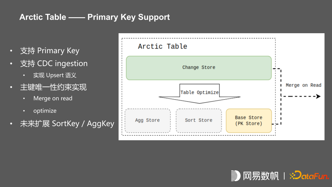 我们在架构上把 Arctic Table 划分为多个 Table store,流写入叫 Change store,批写入叫 Base store,并通过 table optimize 实现 primary key 的唯一键约束。primary key 提供的是 upsert 语义,包括 CDC ingestion,Batch Insert 的时候可以实现基于组件的更新,并通过 merge on read 保证唯一性约束。每个 table store 的实现都是一个 iceberg 表,未来在提供 base store 之外,还会提供 SortKey、AggKey。