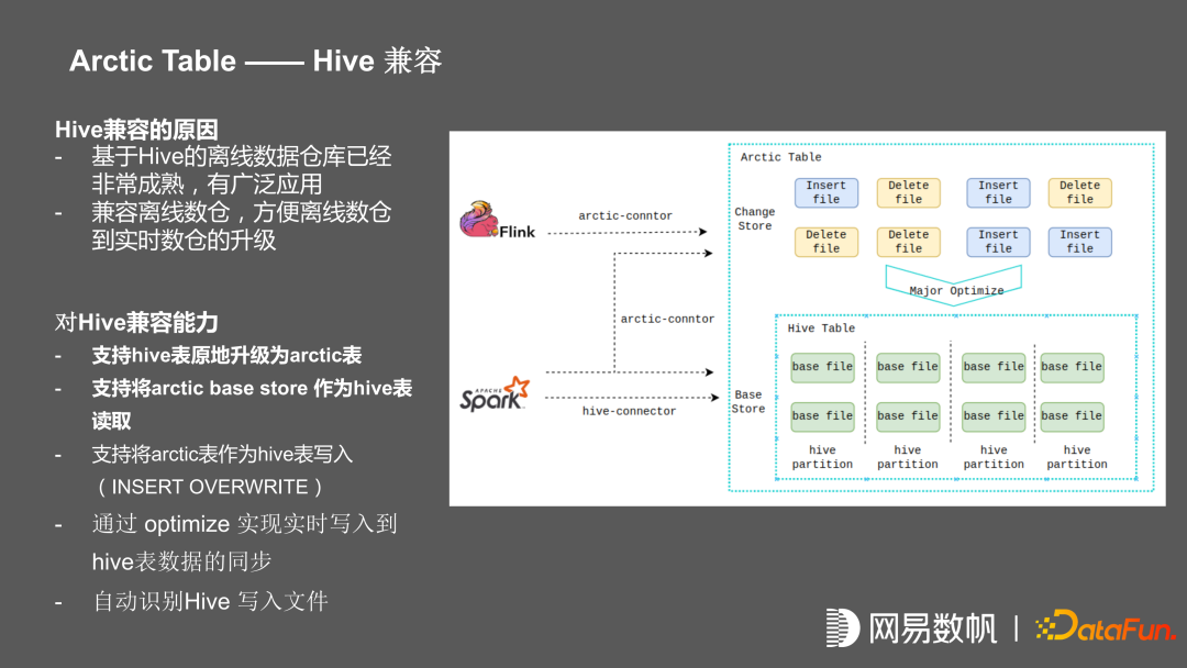 推广的过程中,在内部首先推广 iceberg,但是我们在推广流批一体的过程中,发现已经有很完善的 hive 生态;包括基于 hive 构建的一整套大数据的方法论,和围绕 hive 的中台组件,我们发现几乎不太可能离开 hive 。我们后来就对基座重新做了规划,在支持 iceberg 当作基座的情况下,又支持直接将 hive 作为基座。在这种情况下,支持直接将 hive 原地升级为 arctic 表,原地升级的意思是会保留 hive 表,并且保留原有 hive 表上所有任务。对原有的 hive 表的读写任务是没有任何侵入的。支持将 hive 表升级成 arctic 表之后,支持将 arctic base store 作为 hive 表进行读写,支持通过 Flink 任务往 arctic 表上写,通过我们的 optimize 往 hive 表同步。使得在离线场景中不用做任何改动的情况下,增加离线表的实时能力。