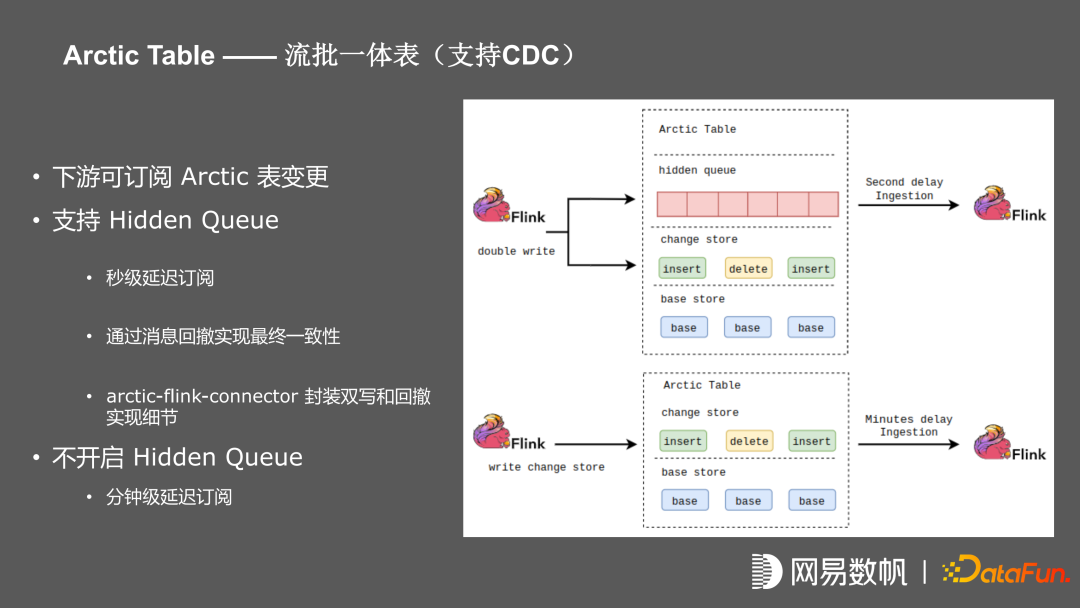为了增强流处理下的应用场景,进行了 hidden queue 封装,在 Arctic table 内部封装kafka,对实时性要求高的上游任务进行双写,即往 change store 写同时也写入 hidden queue,下游直接从 kafka 消费,以此达到秒级甚至毫秒级的 CDC。如果不开启 hidden queue,上游只写 change store,下游利用 iceberg incremental poll 实现分钟级别订阅,整个双写过程通过 Arctic-Flink-connector 进行封装。