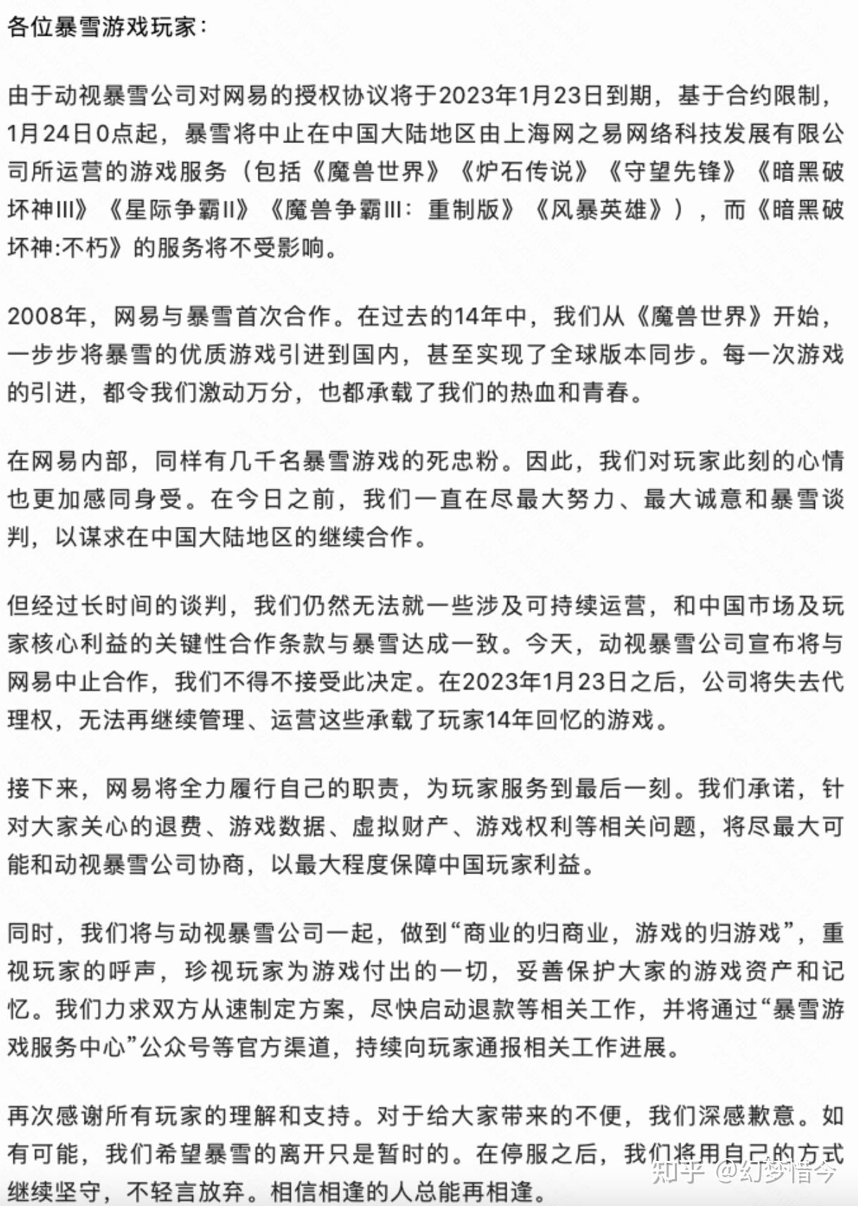 11月17日,动视暴雪(简称暴雪)投资方官网宣布,由于目前与网易的授权协议将于2023年1月23日到期,中国大部分暴雪游戏服务将暂停。包括魔兽世界,炉石,魔兽争霸3:重制版,守望先锋,星际争霸系列,暗黑破坏神3,风暴英雄。