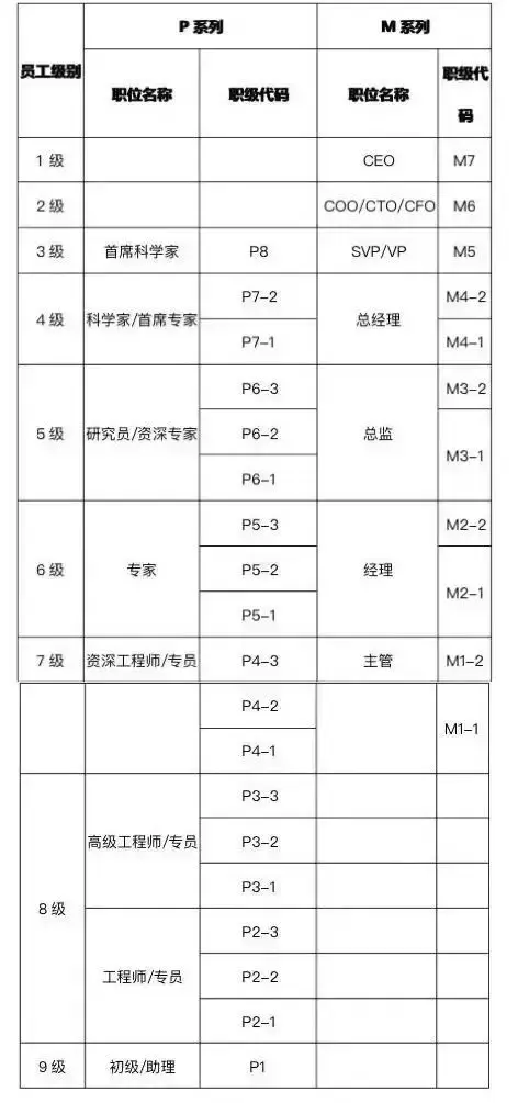 技术岗普遍为P3-P6,P7-P8为高层,管理岗为M1-M8,M3以上算高管。