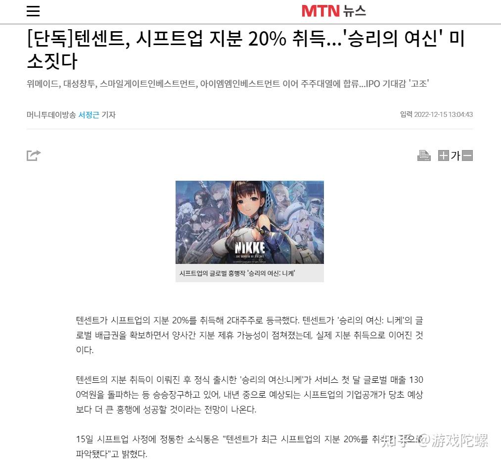 近日,据韩媒报道,腾讯投资《胜利女神:NIKKE》游戏研发商Shift Up,并获得了20%股权。投资完成,腾讯将成为仅次于Shift Up创始人金亨泰的第二大股东。目前,腾讯方面并未透露这起投资相关金额。