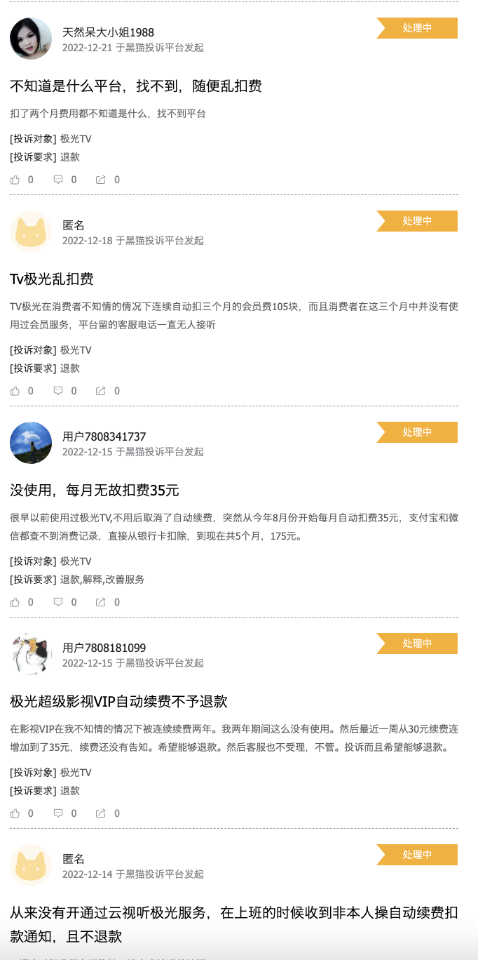12月26日消息,在黑猫投诉平台上,有消费者投诉极光TV存在已取消会员后仍在持续自动扣费、开通会员后还需单片付费才能观看内容等等问题。