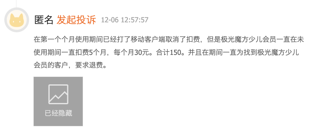 一名匿名消费者称,其“在第一个个月使用期间已经打了移动客户端取消了扣费,但是极光魔方少儿会员一直在未使用期间一直扣费5个月,每个月30元。合计150。并且在期间一直未找到极光魔方少儿会员的客户,要求退费。”