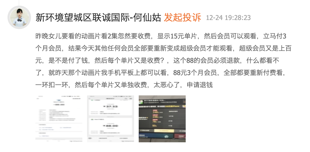 “昨晚女儿要看的动画片看2集忽然要收费,显示15元单片,然后会员可以观看,立马付3个月会员,结果今天其他任何会员全部要重新变成超级会员才能观看,超级会员又是上百元,是不是付了钱,然后每个单片又是收费?这个88的会员必须退款,什么都看不了,就昨天那个动画片我手机平板上都可以看,88元3个月会员,全部都要重新付费看,一环扣一环,然后每个单片又单独收费,太恶心了,申请退钱。”