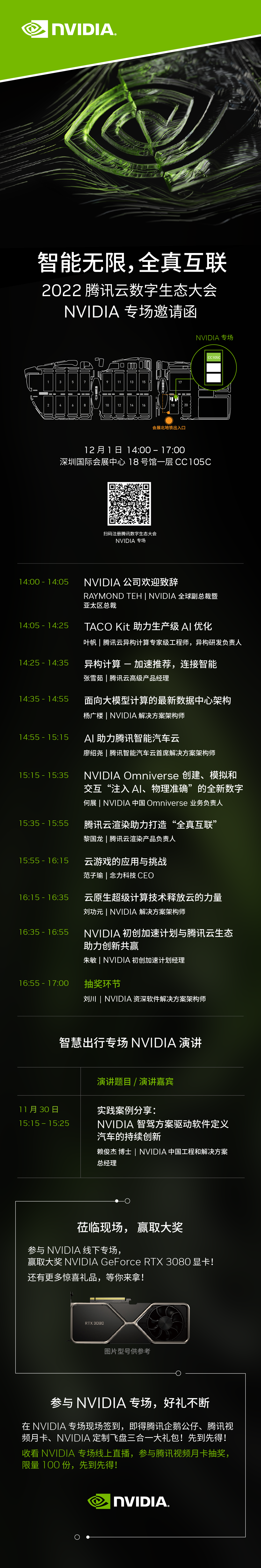 作为本次大会的一大看点,12 月 1 日 14:00 举行的 NVIDIA 专场请一定不要错过!NVIDIA 全球副总裁暨亚太区总裁 Raymond Teh 将携手九位行业专家,围绕 NVIDIA 与腾讯云的合作成果开展一系列演讲,为您深入解读 NVIDIA 涵盖硬件、系统软件、平台软件、应用框架的全栈式 AI 解决方案,揭秘基于 NVIDIA GPU 的腾讯云加速计算套件 TACO Kit、异构计算平台、云端自动驾驶等产品,解析云渲染、大模型、云游戏、数字孪生的最新进展。此外,还将介绍 NVIDIA 初创加速计划,更有彩蛋福利(戳文末了解详情)为您奉上!速速扫描下方海报中的二维码预约参会!