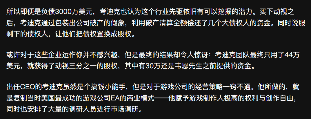 40年前雅达利大崩溃时,烤迪克的团队最终只用了44万美元,就获得了动视三分之一的股权,其中30万还是TMD别人投的钱。