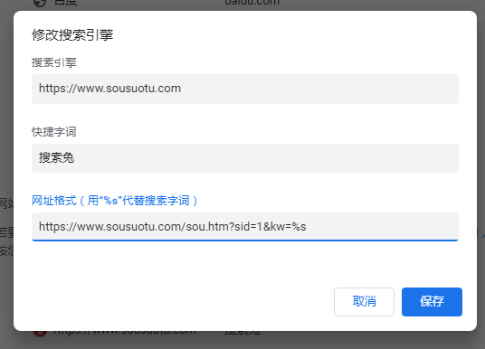 4.填入网站信息和搜索网址,下面以搜索兔为例填入,然后点击“保存”按钮。